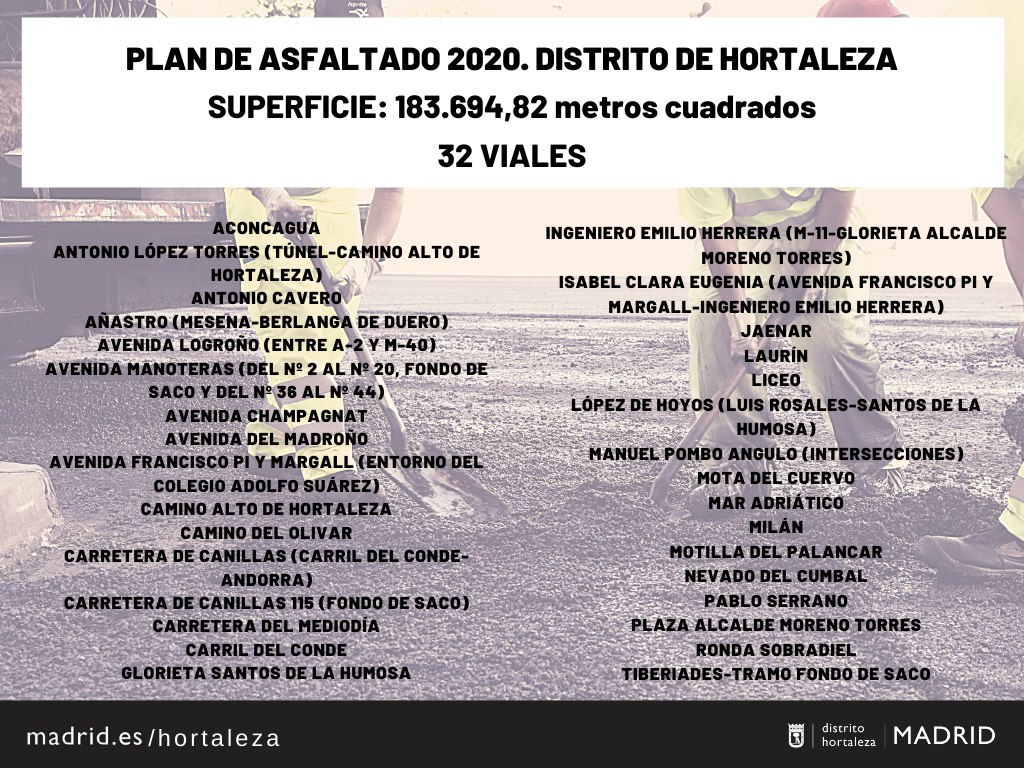 La operación asfalto 2020, que lleva a cabo el Área de Obras y Equipamientos del Ayuntamiento de Madrid, ya se ha puesto en marcha y en Hortaleza renovará el pavimento de 32 viales del distrito, con una superficie total de 183.694,82 metros cuadrados.