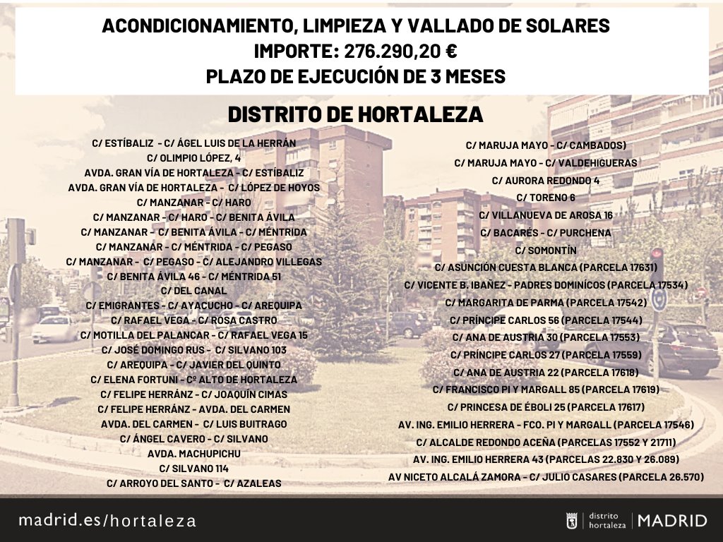 Además, el próximo 1 de junio comenzarán los trabajos de acondicionamiento, limpieza y vallado de un total de 44 solares municipales en el distrito de Hortaleza. Dichas actuaciones se tiene previsto que tengan una duración de 3 meses y supondrán una inversión de 276.290,20 euros.