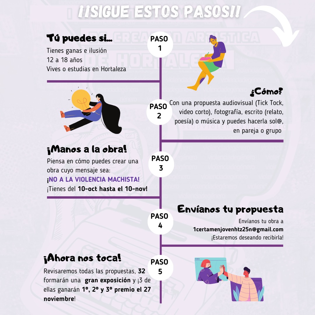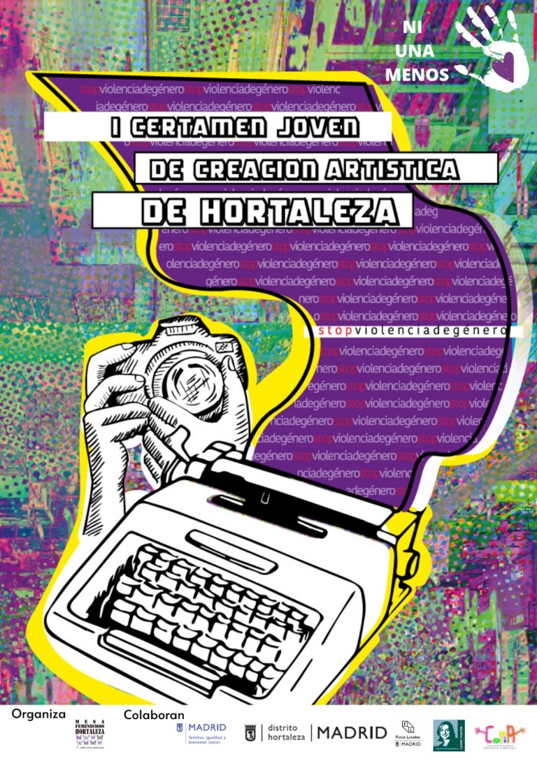 La Mesa de Feminismos y Diversidad Sexual del Foro Local de Hortaleza organiza el I Certamen Joven de Creación Artística de Hortaleza con motivo del Día Internacional de la Eliminación de la Violencia contra las Mujeres (25N) en colaboración con la Unidad de Igualdad de la Junta Municipal de Hortaleza, la Unidad de Participación Ciudadana de dicha Junta, las Mesas de Educación y Juventud, Cultura y Festejos y Procesos Participativos del Foro Local de Hortaleza, el Espacio de Igualdad Carme Chacón y la Comisión de Participación de la Infancia y Adolescencia de Hortaleza.