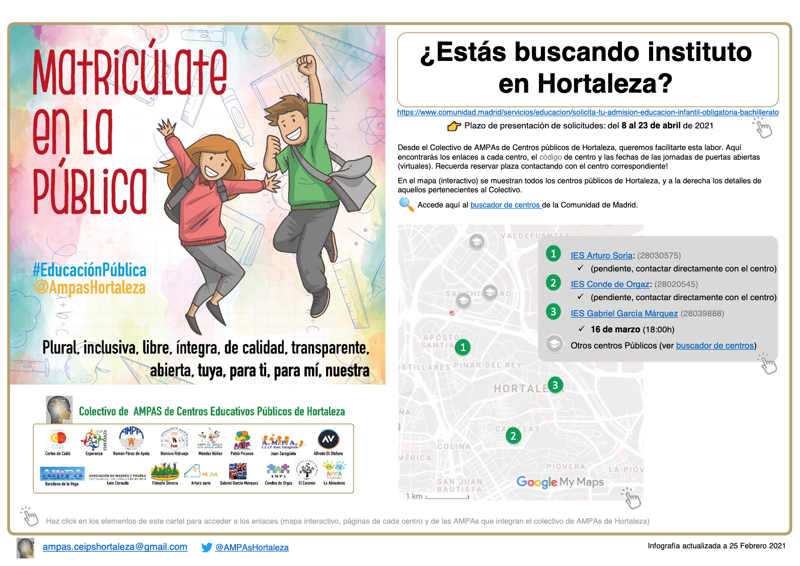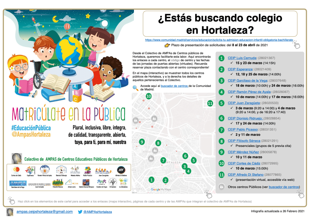 Desde el colectivo de AMPA de Hortaleza, se quiere dar visibilidad a los centros públicos existentes en el distrito de Hortaleza. Así que os presentamos estas dos infografías esperando que os sea de utilidad.