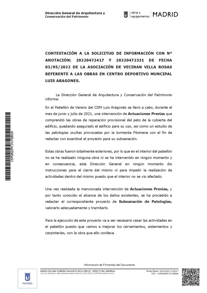 En el Pabellón de Verano del CDM Luis Aragonés se llevó a cabo, durante el mes de junio y julio de 2021, una intervención de Actuaciones Previas que comprendió las obras de reparación provisional del peto de la cubierta del edificio, quedando asegurado el edificio para su uso, así como un estudio de las patologías ocultas provocadas por la tormenta Filomena con el fin de redactar con exactitud el proyecto para su subsanación.