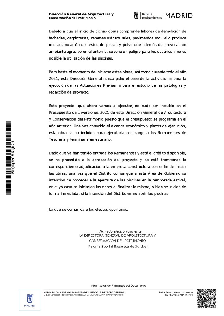 Dado que ya han tenido entrada los Remanentes y está el crédito disponible, se ha procedido a la aprobación del proyecto y se está tramitando la correspondiente adjudicación a la empresa constructora con el fin de iniciar las obras, una vez que el Distrito comunique a esta Área de Gobierno su intención de proceder a la apertura de las piscinas en la temporada estival, en cuyo caso se iniciarían las obras al finalizar la misma, o bien se inicien de forma inmediata, si la intención del Distrito es no abrir las piscinas.