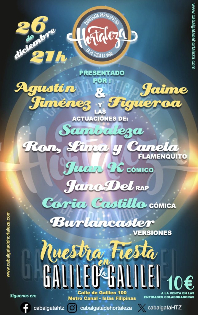 El martes 26 diciembre, a las 21.00 horas, se celebrará la tan esperada fiesta en la sala Galileo Galilei. El evento estará presentador por Agustín Jiménez y Jaime Figueroa y se contará con los monologuistas Juan K y Coria Castillo y con las actuaciones de Sambaleza; el grupo de flamenco Ron, Lima y Canela; el rap de JanoDel y el grupo de versiones Burlancaster.