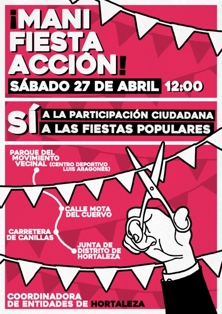 Porque de eso se trata, de defender la alegría y la participación ciudadana. Nos manifestamos contra decisiones arbitrarias e injustas que discriminan a unos barrios frente a otros, que pretenden aguarnos las fiestas vecinales con trabas y prohibiciones. Nos manifestamos porque no aceptamos recortes ni imposiciones en las Fiestas de Hortaleza: cada vez más cortas y cada vez menos participativas.