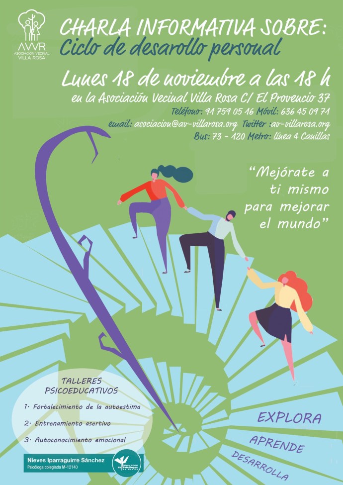 Ciclo de Desarrollo personal Charla-Presentación “Mejórate a ti mismo para mejorar el mundo” Presentación del “Ciclo de Desarrollo Personal”, imparte Nieves Iparraguirre, psicóloga psicoterapeuta, con 25 años de experiencia en el campo del desarrollo personal. …